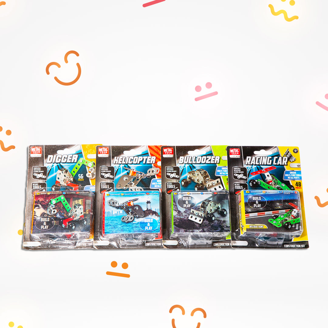 Metal Tech Model (Randomly Selected): As you have fun building and playing with this Metal Tech Model set, you'll strengthen hand-eye coordination, problem-solving and fine motor skills. It comes in different designs randomly selected Designs: racing car, helicopter, bulldozer and digger.
